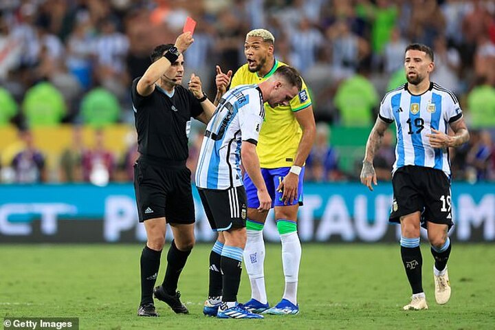 Brazil substitute Joelinton was sent off not long after coming on after shoving De Paul in the chest - with the Argentina midfielder collapsing in dramatic fashion, clutching his face.
