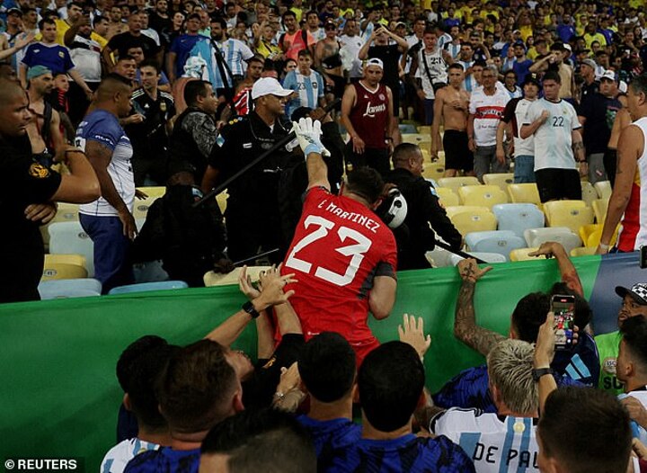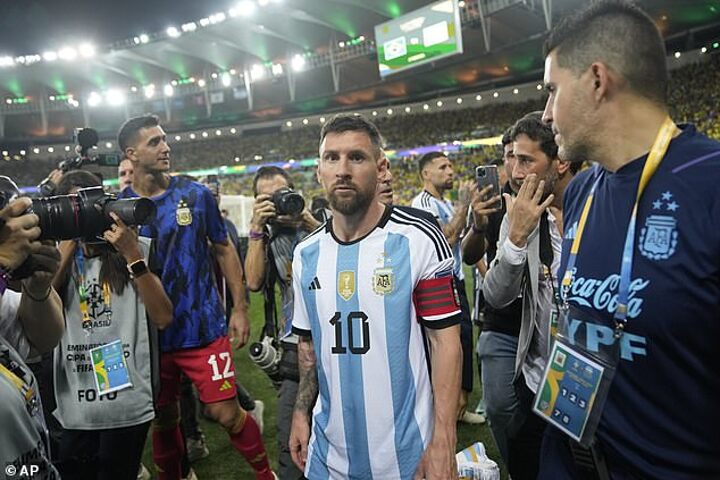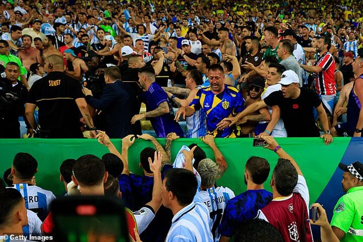 Brazil could reportedly face a point deduction or be forced to play behind closed doors following the chaos that marred their 1-0 defeat to arch-rivals Argentina at the Maracana.A mass brawl broke out in the stands ahead of the game between rival supporters, before clashing with police, forcing kick-off to be delayed by half-an-hour. Some players from both sides approached the stands to try and calm fans down, though Argentina goalkeeper Emiliano Martinez leapt up towards the stands to slap a baton out of an officer's hands before being restrained by his team-mates. The Brazilian Football Confederation could face punishment as Article 17 of the FIFA disciplinary code states that 'hosts clubs and associations are responsible for order and security before, during and after matches. It adds that hosts are 'liable for incidents of any kind' that take place.Brazilian publication Globo reports that FIFA are set to open an investigation into the events that took place. While FIFA's disciplinary code does not provide specific punishments, Globo claim that punishments can include fines, playing one or more matches without fans, an obligation to play on a neutral field or even deduction of points. A points deduction could be a big hit for Brazil who have only taken seven points from their opening six games in World Cup qualifying, and sit sixth out of ten teams. Only six teams from the South American section automatically qualify for the World Cup, while the seventh placed side goes into an Inter-confederation play-off. In a post on Instagram, FIFA president Gianni Infantino lamented the violence that occurred at the Maracana. His message read: 'There is absolutely no place for violence in football, on or off the field. Such events, such as those seen during the FIFA World Cup qualifying match between Brazil and Argentina at the Maracanã Stadium, have no place in our sport or society. 'Without exception, all players, fans, staff and officials need to be safe and secure to play and enjoy football, and I urge the relevant authorities to ensure this is respected at all levels.' It is unclear what sparked the incident involving rival fans at the Maracana earlier this week. Fans could be seen ripping seats from the stands and launching them at rival supporters, while hoards of Rio de Janeiro police swiftly intervened but struggled to curb the melee before using batons on the brawling fans.Parts of seats flew around and hit some of the spectators behind one of the goals. At least one fan left the stadium bleeding from his head, while a video of the scenes showed a supporter profusely bleeding while lying on a gurney on the ground. Some fans climbed over the railings to escape the violence in the stands with mothers seen sheltering young children. Other supporters were seen in tears after the violent scenes were finally quelled, clearly left shaken up as they waited to see their teams in action. Injured Argentina and Manchester United center back Lisandro Martinez commented on Instagram: 'It's a shame to see what Brazilian police are doing! So how can that be possible? How long we have to see these scenes?! It's always the same [in Brazil].' Following the game, Lionel Messi launched a scathing attack on the Brazilian police, saying: 'We saw how [police] were hitting the people, it already happened in the Libertadores final. They were more focused on that than on the game.' The Ballon d'Or winner was referring to the scenes at the Maracana before Fluminense's win over Boca Juniors this year. 'We went to the locker room because it was the best way to calm everything down, a tragedy could have happened,' he added Amid the tumult, Messi ultimately led his Albiceleste teammates back into the locker rooms.The reigning World Cup winners initially appeared to be refusing to return to the field for kickoff before CONMEBOL gave them 15 minutes to take the field. Argentina told their Brazil rivals they would only return to the pitch after the situation was calm. They eventually returned after 22 minutes in the dressing room, and warmed up for another three minutes before the game was finally started