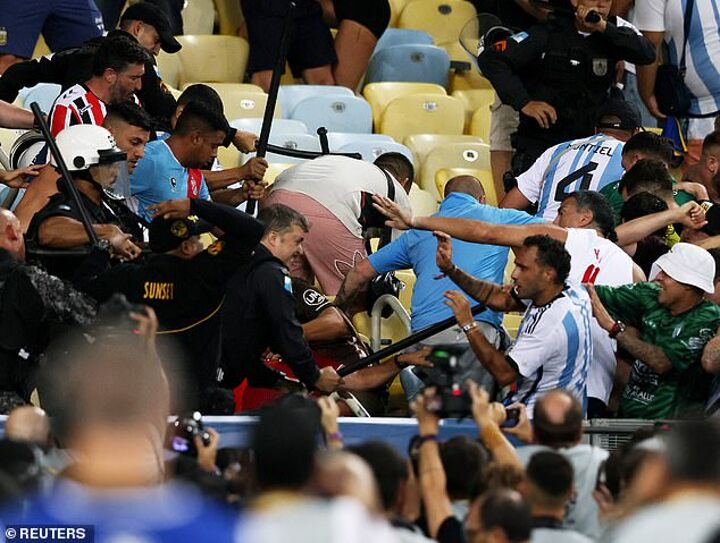 It is one of the game's longest and fiercely fought rivalries, and Tuesday's World Cup qualifier was no exception with as many as 22 fouls in the opening 45 minutes between the two old rivals.But before a ball could even be kicked there was controversy, with kick-off delayed by 27 minutes after fights broke out in the crowd between Argentina and Brazil fans, with police wading in armed with batons.