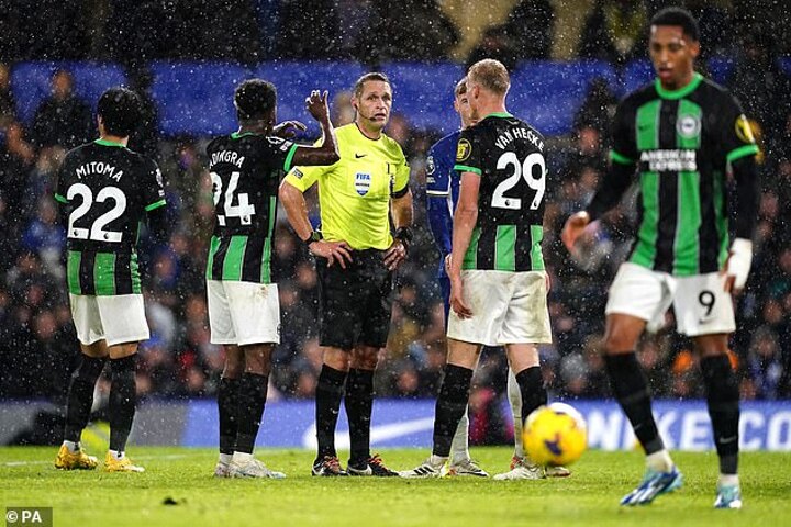 An Enzo Fernandez brace helped the Blues to a 3-2 win at Stamford Bridge, but a stoppage time goal from Joao Pedro had reduced the deficit, and there was further drama when referee Craig Pawson appeared to give the Seagulls a penalty.However, a VAR check led to Pawson consulting the screen, and judging that Levi Colwill - formerly at Brighton as a loan player - was not guilty of handball, with the ball hitting his face before going out for a corner kick.