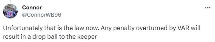 Another user of the platform had to explain the situation, which is not common knowledge among football fans. They wrote: 'Unfortunately that is the law now. Any penalty overturned by VAR will result in a drop ball to the keeper'.