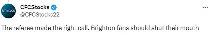 However, other users were more understanding of Pawson's application of the law, noting: 'The referee made the right call. Brighton fans should shut their mouth'.