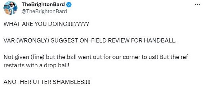 This led to some frustration among the Brighton players, who were denied an opportunity to try and snatch an equaliser from the set piece.