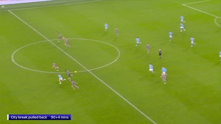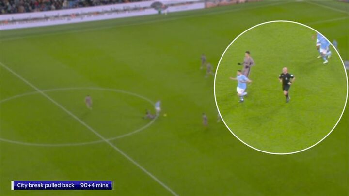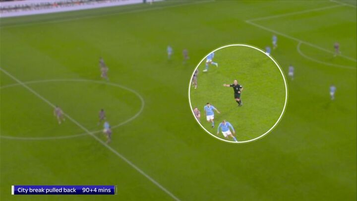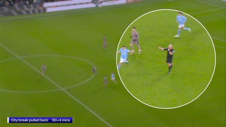 With the fantastic game nearing its end, Erling Haaland played Jack Grealish through on goal for a one-on-one, but after giving an advantage for a foul on Haaland by Emerson Royal, referee Simon Hooper brought the play back as Grealish brought the ball down.